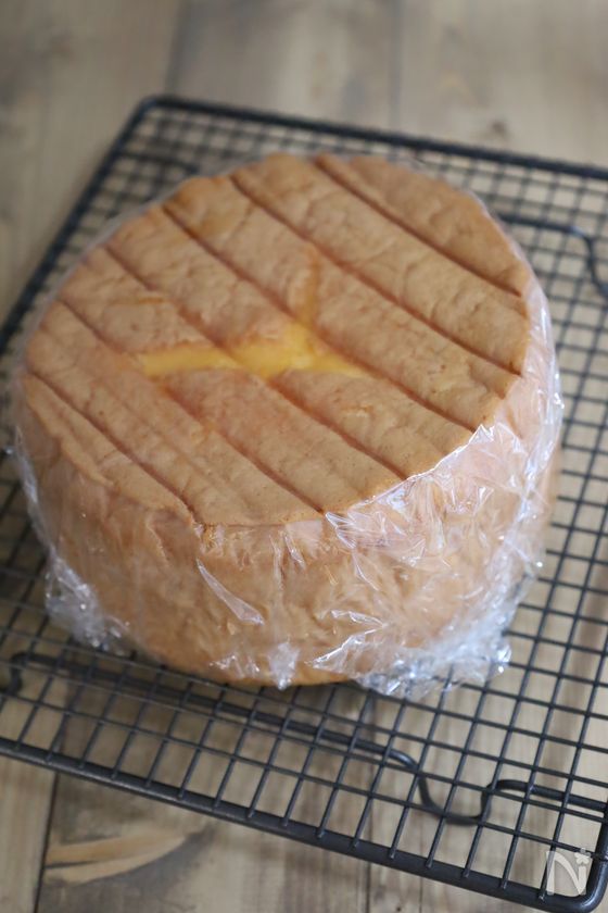 (14) 粗熱が取れたらひっくり返し、サランラップを巻いて乾燥を防ぐ。