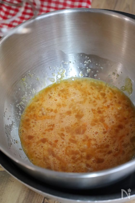 砂糖は混ぜる直前に卵に加えること。予め混ぜておいておくと卵の泡立つ力が弱まってしまいます。