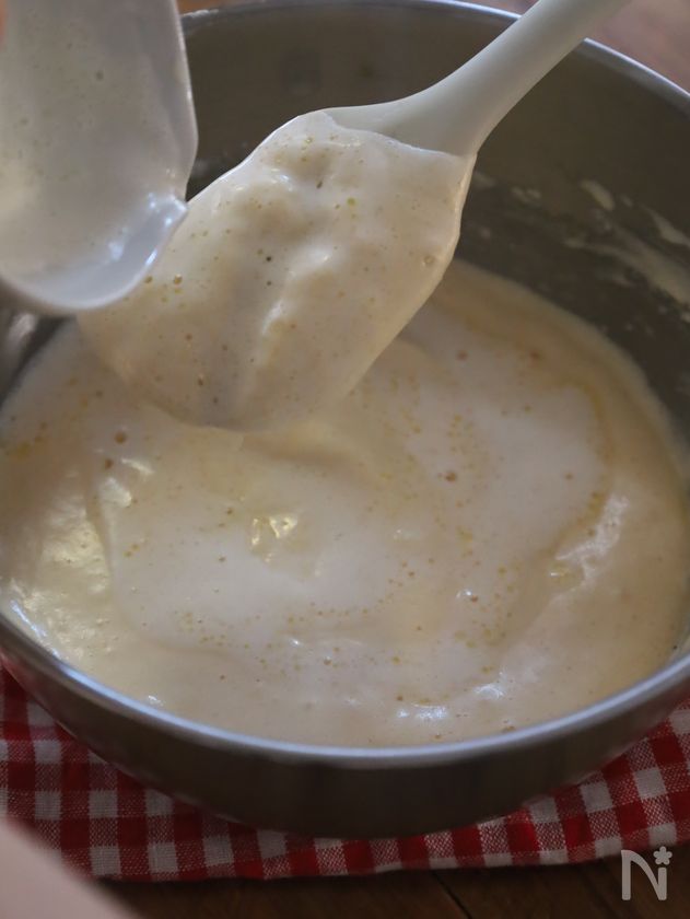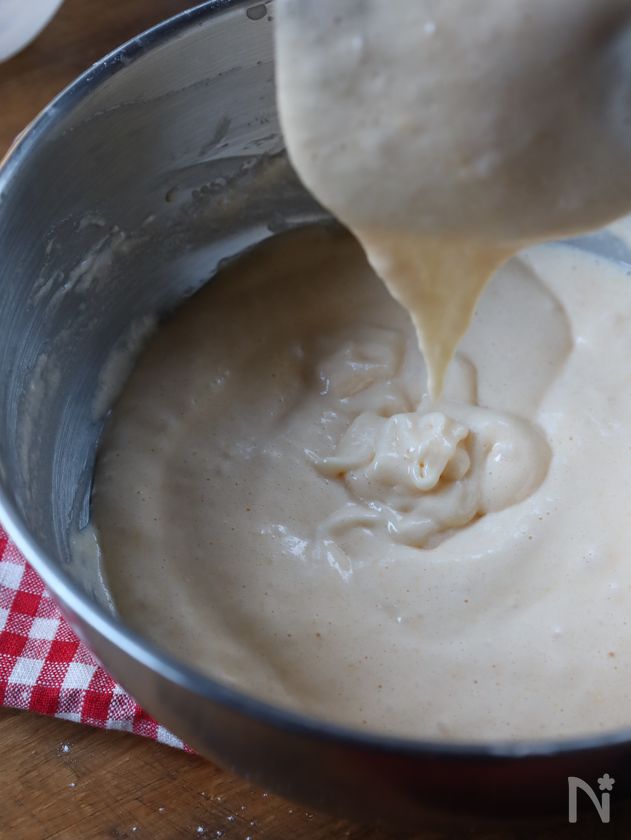 (9) 生地をよく混ぜて馴染ませたら、再度6のボウルに戻しいれる。