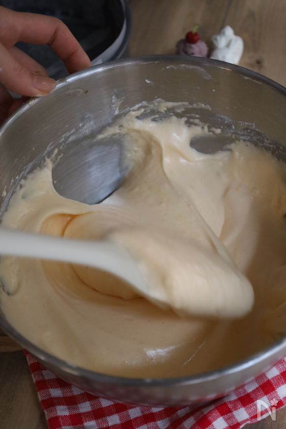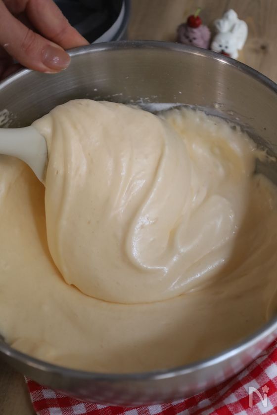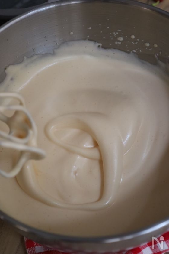(5) 生地で「の」の字が描け、暫く跡が残るくらいまで泡立てられていればOKです。