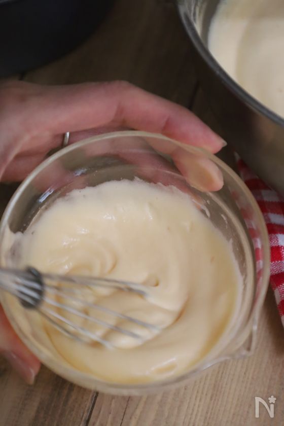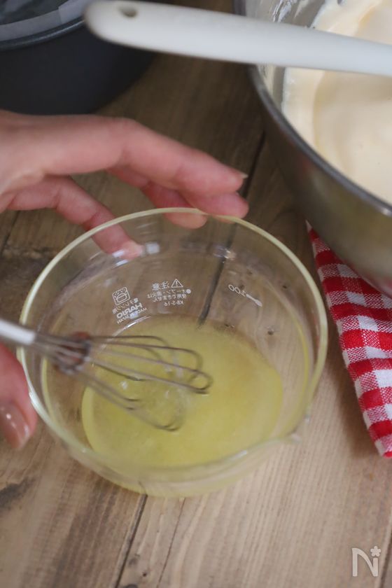 (8) 湯煎にかけておいた【B】をよく混ぜ、そこに6の生地をヘラでひとすくいして加える。