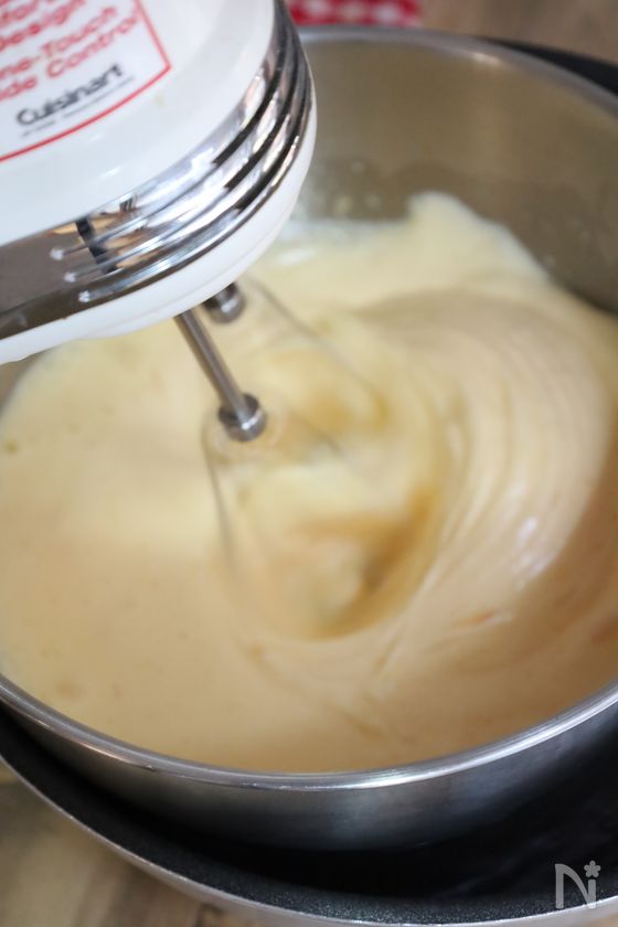 (2) 湯煎にかけたまま、ハンドミキサーの高速で3分間泡立てる。