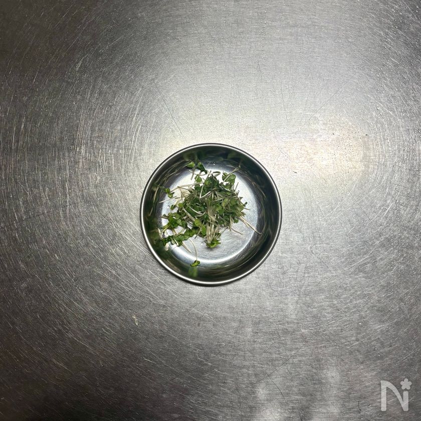 (5) 煮汁適量とともに器に盛り、②の貝割れ菜をのせる。
