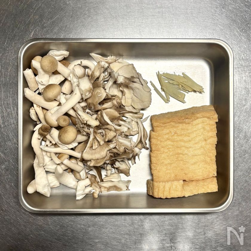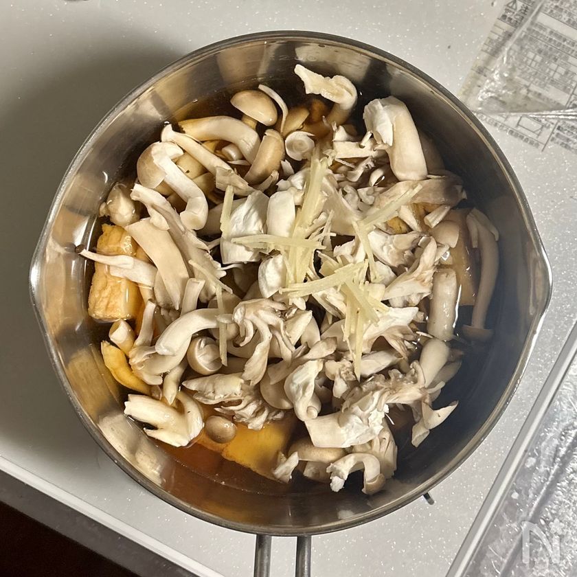 (3) 鍋に【A】を入れて中火にかけ、煮立ったら①の厚揚げ、きのこ、しょうがを順に加える。