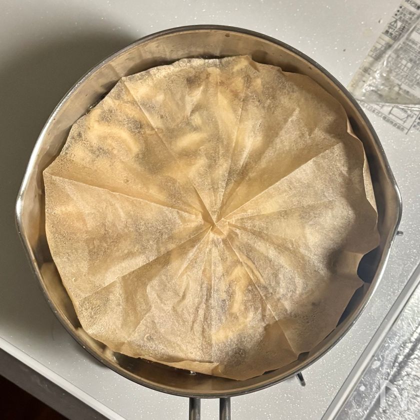 (4) 再び煮立ったら弱火にし、オーブンペーパーで落としぶたをして15分ほど煮る。