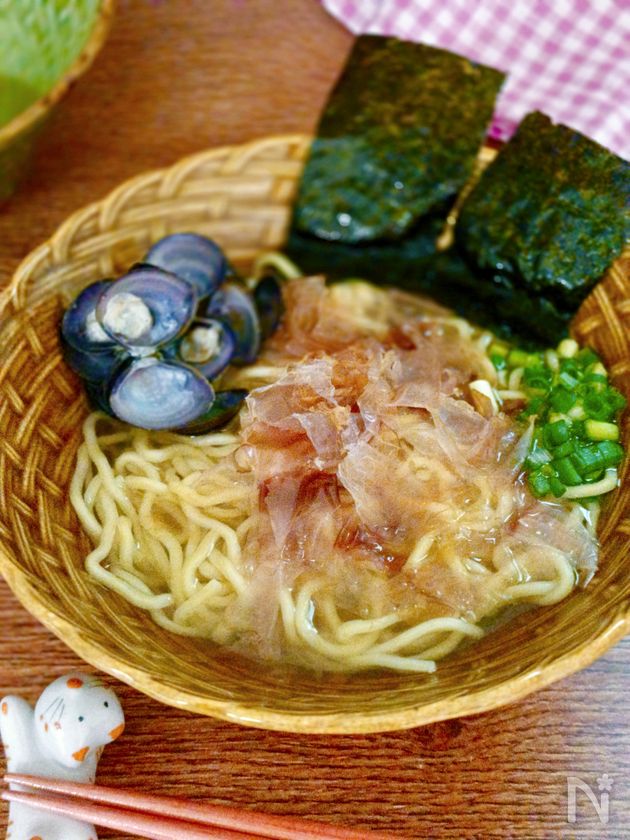 (3) だしパックを取り出し、【A】で味をととのえる。 茹でた生ラーメンと一緒に器に盛り、しじみ+刻みねぎ+かつお節+味付のり(8切)をのせる。
