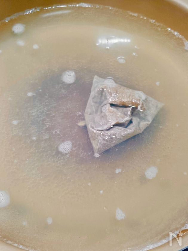 (2) しじみを一旦取り出し、残ったスープに水1Lを加えて沸騰させる。沸騰したらだしパックを入れ、中火で5分ほど煮出す。