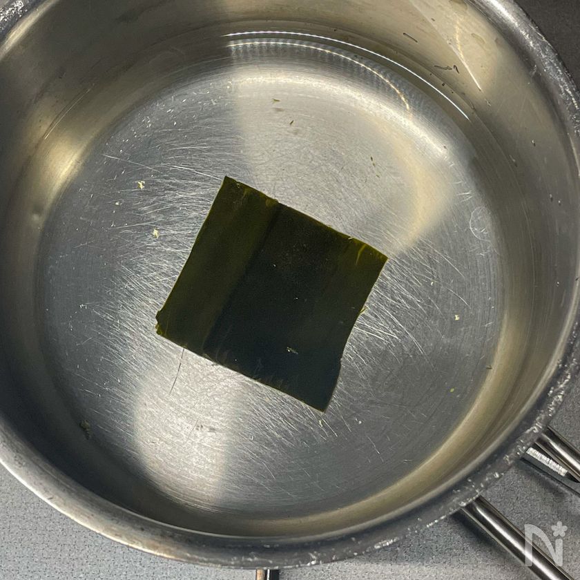 (下準備) 水に昆布をつけ、30分以上(できれば数時間)おく。