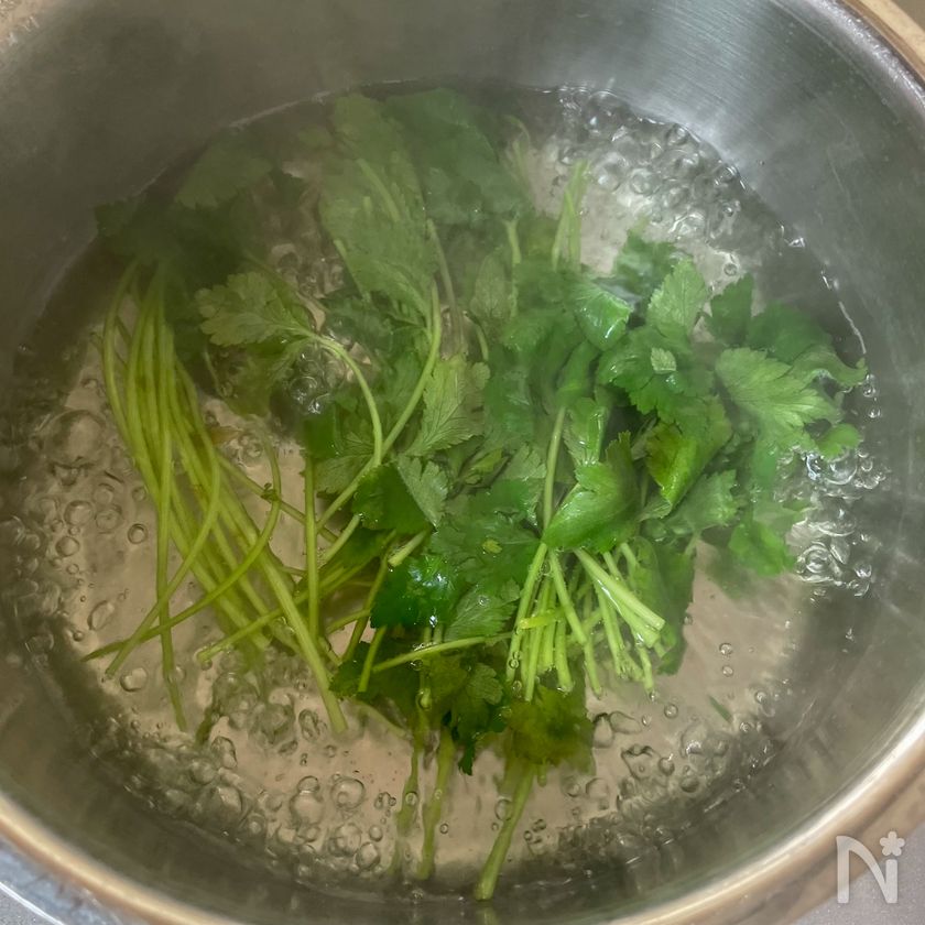 茎を30秒ほどゆでたら葉を加え、1分ゆでる。