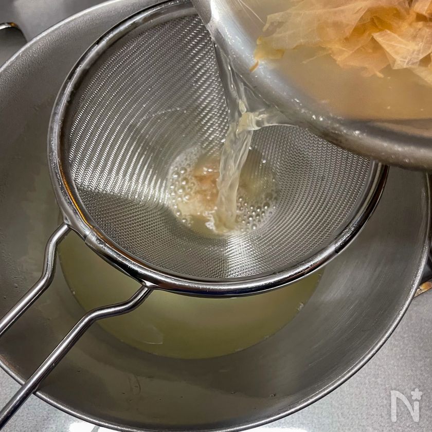 削り節が沈んだら、こし器やキッチンペーパーでこす。