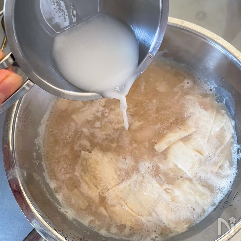 沸騰したら生湯葉を加え、弱火で1分煮る。