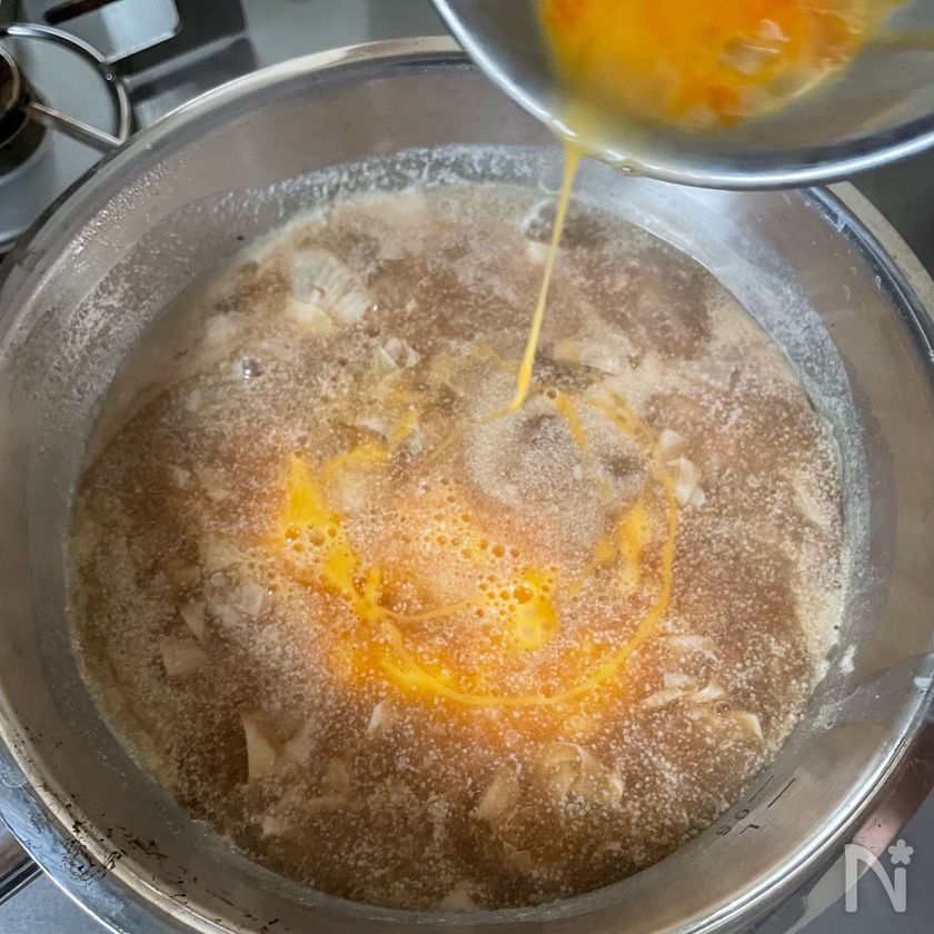 (4) 卵を溶きほぐして加え、サッと火を通す。