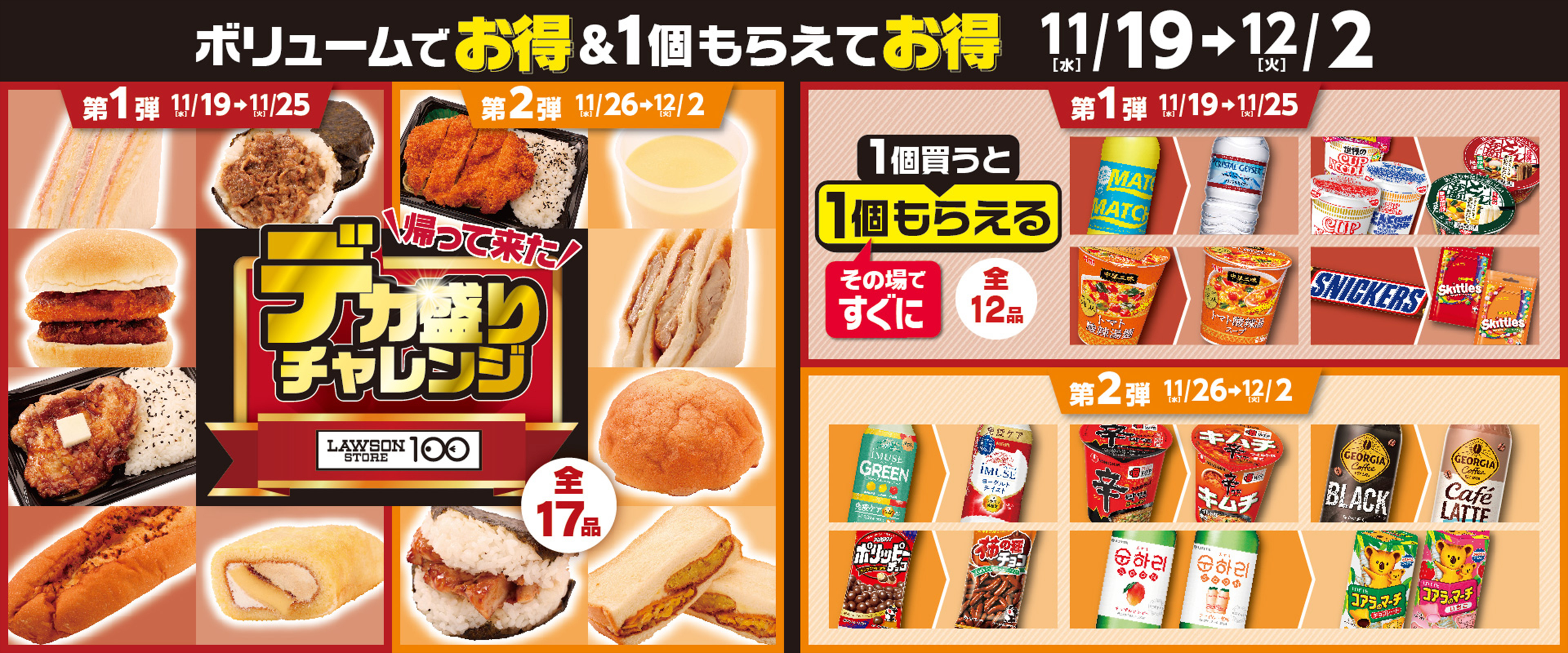 【速報】満足感もおトクもダブルでゲット!ローソンストア100、11月19日からの「デカ盛りチャレンジ」と「1個買うと1個もらえる」フェア
