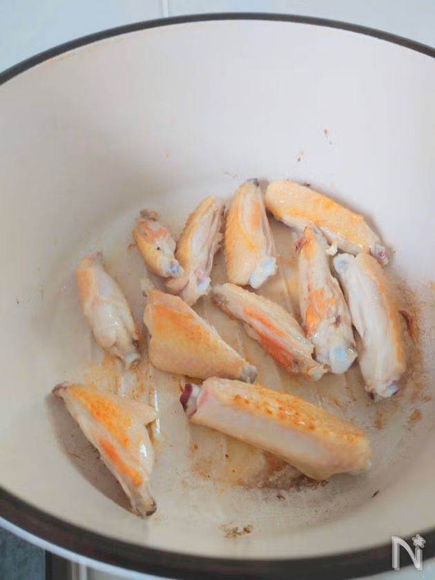 (1) 鍋に少量の油(分量外)を加えて熱し、手羽中を加えて表面にこんがりと焼き色をつける。