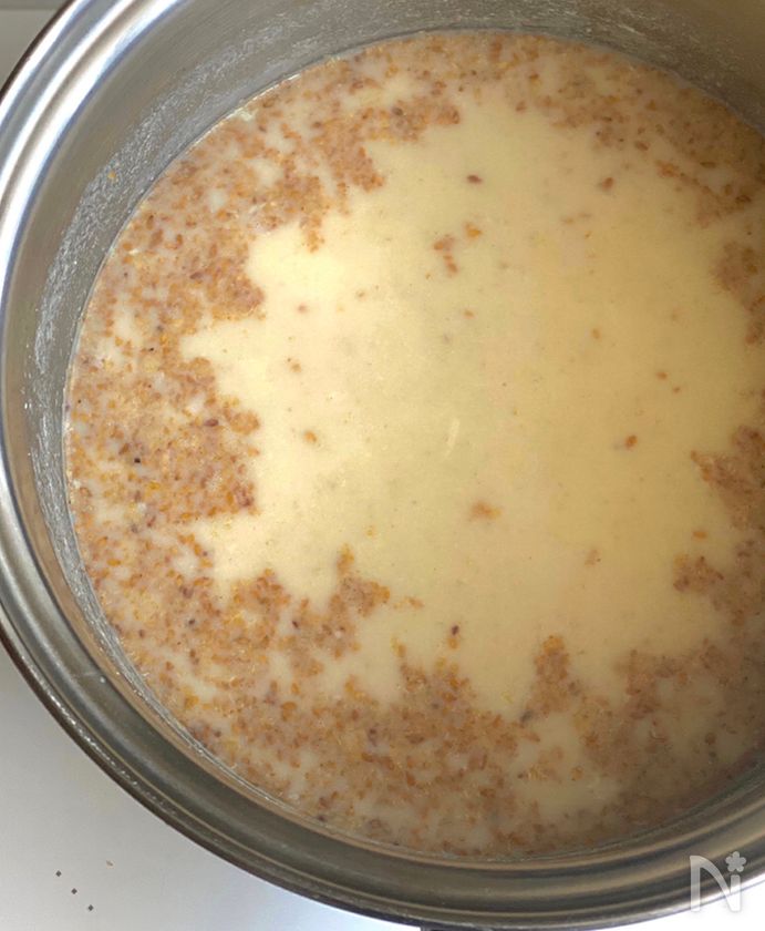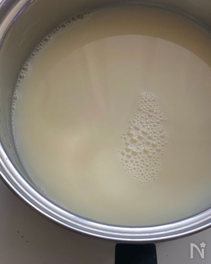 (2) 鍋に【B】を入れて中火で熱し温まってきたら無調整豆乳(または牛乳)を加えて一煮立ちさせ、塩で味を整え火を止める。