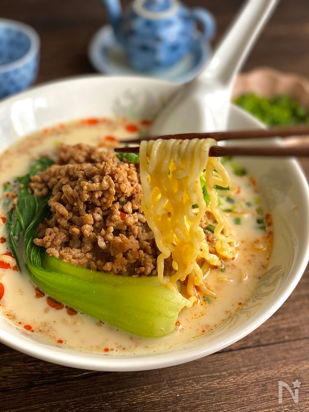 (4) 器にスープを入れラー油またはごま油を垂らし、肉味噌を盛り付ける。小ネギや長ネギをトッピングすると美味しいですよ😊花椒をふれば本格的な味に♪