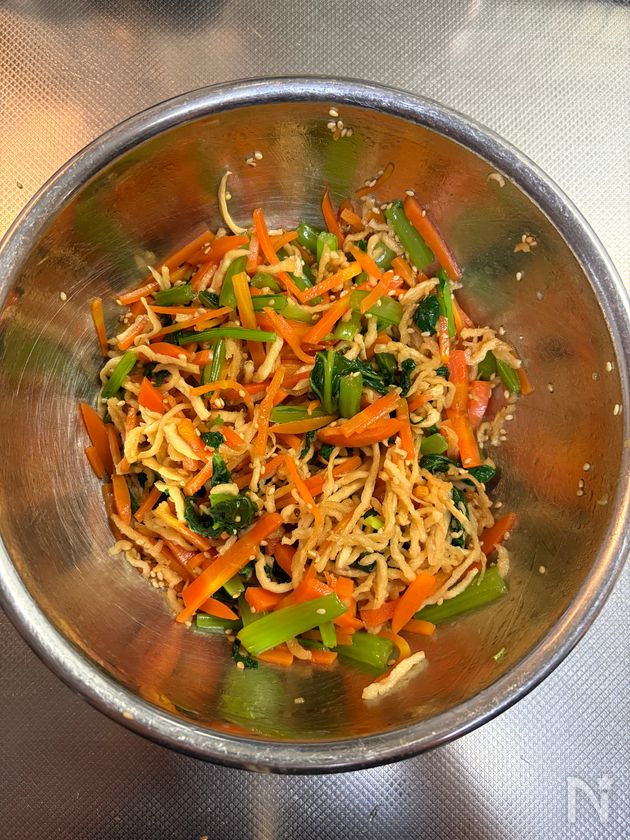 (3) ボウルに【A】を合わせ、切干大根・にんじん・小松菜を加えて混ぜる。