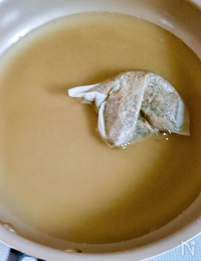 (1) 小さめの鍋に【A】を入れ、沸騰させる。沸騰したら弱火にして10分ほど煮出し、だしパックを取り出す。
