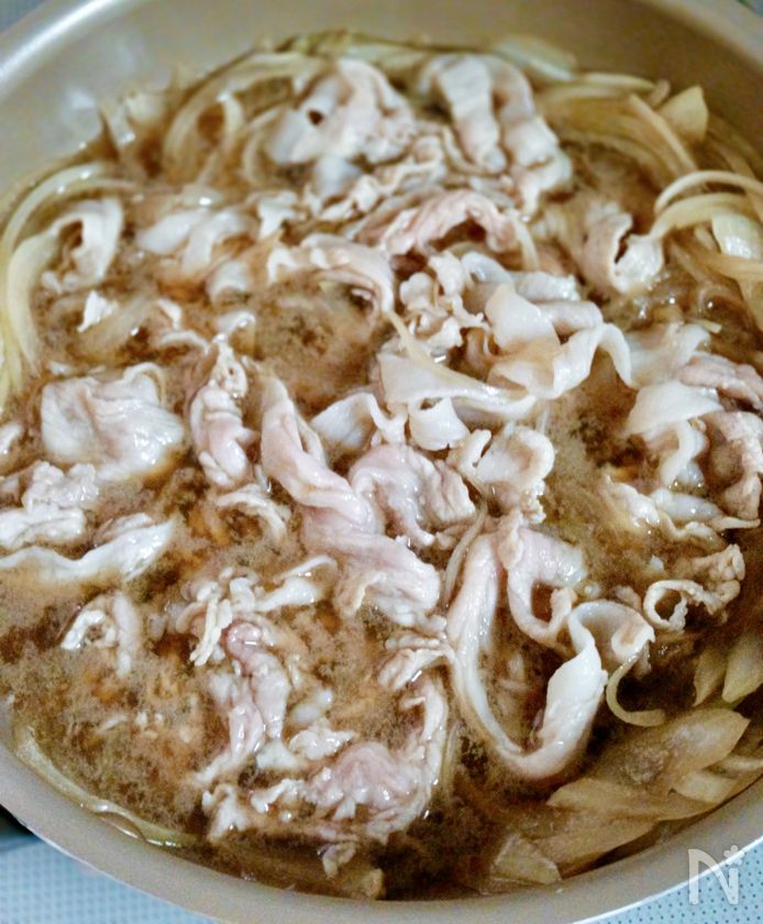 (2) 1の鍋に薄切りの玉ねぎ+【B】を加え、弱めの中火で約2分煮る。豚もも肉薄切りを加えて一口大にほぐし、さらに1分煮る。