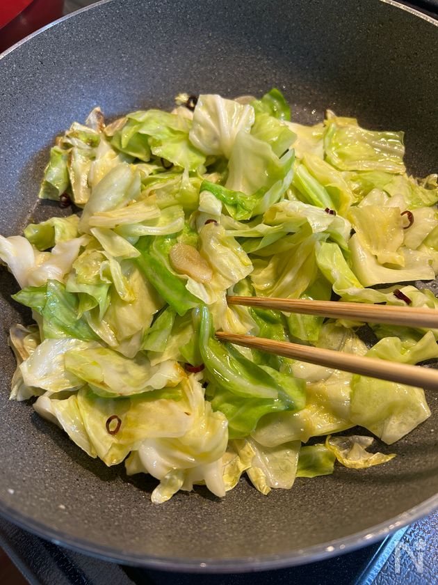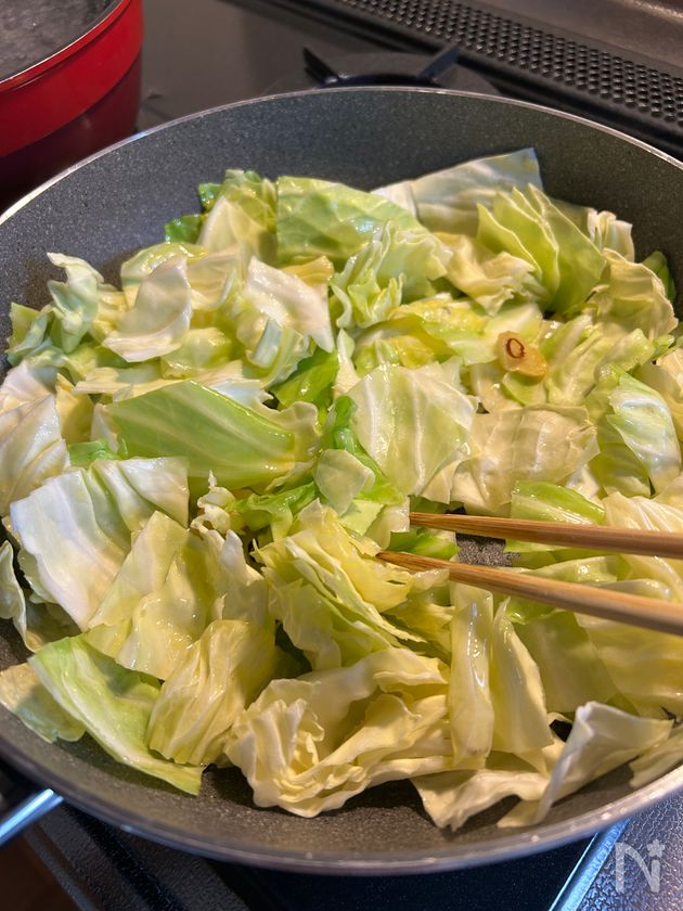 (3) にんにくの香りが出てきたらキャベツと塩少々を加え、油が回るまで炒める。