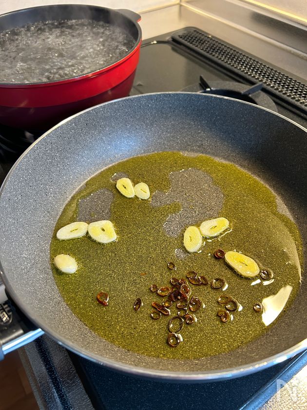 オリーブオイルを入れたフライパンを弱火で熱し、にんにくと赤唐辛子を入れる。