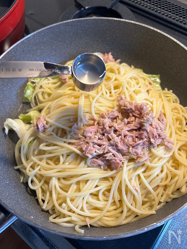 (6) 茹であがったスパゲッティを加える。スパゲッティの上にツナ缶をオイルごとのせ、和風顆粒だし、パスタの茹で汁を加える。