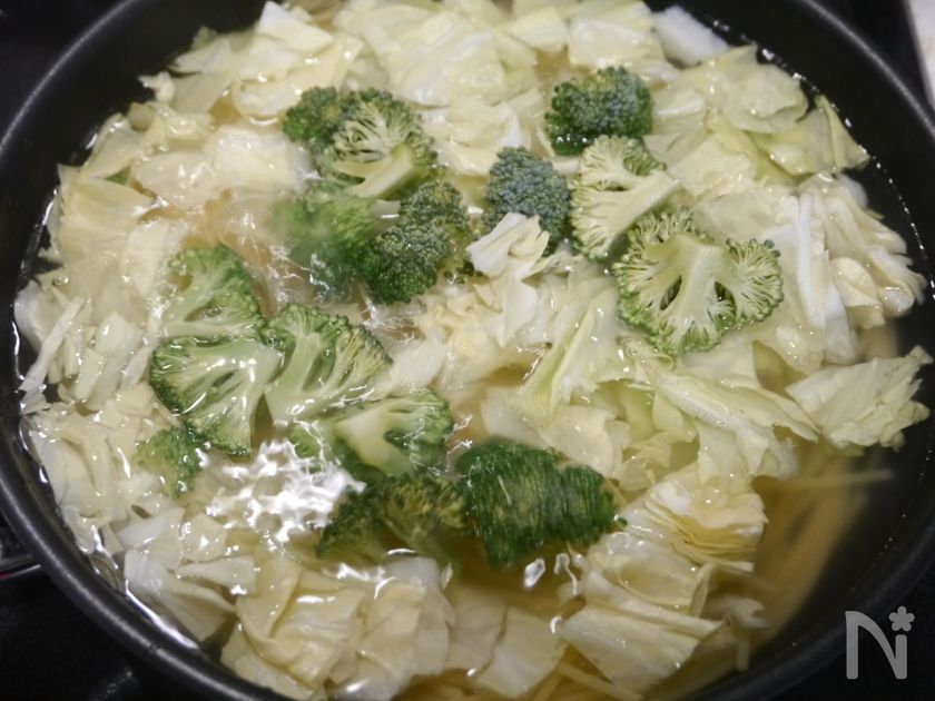 (4) 5分経ったら蓋を取り、火を点けます。フライパンに春キャベツ、ブロッコリー加え、そのまま2分ほど加熱する。