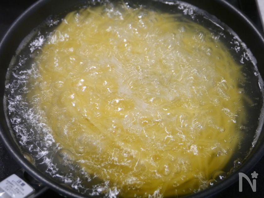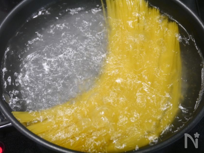 (1) パスタを茹でる。パスタが完全にお湯に浸かり、少し柔らかくなったら蓋をして火を止め、5分放置します。
