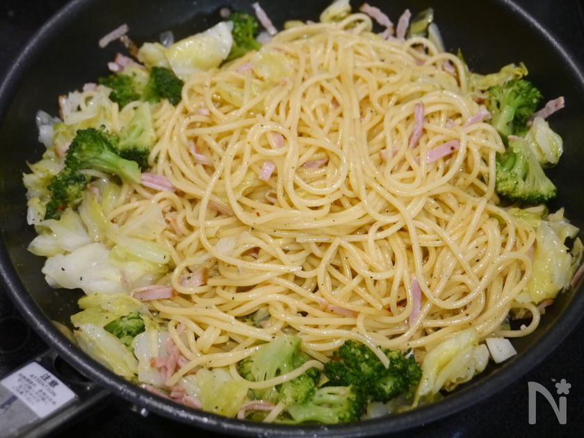 (7) 6にパスタ、春キャベツ、ブロッコリーを戻し、【A】を加えてすべて手早く混ぜ合わせます。全体にツヤが出たら完成。