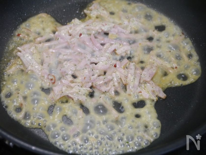 (6) 空いたフライパンで、ベーコンを軽く炒めて煮汁大さじ2を加える。
