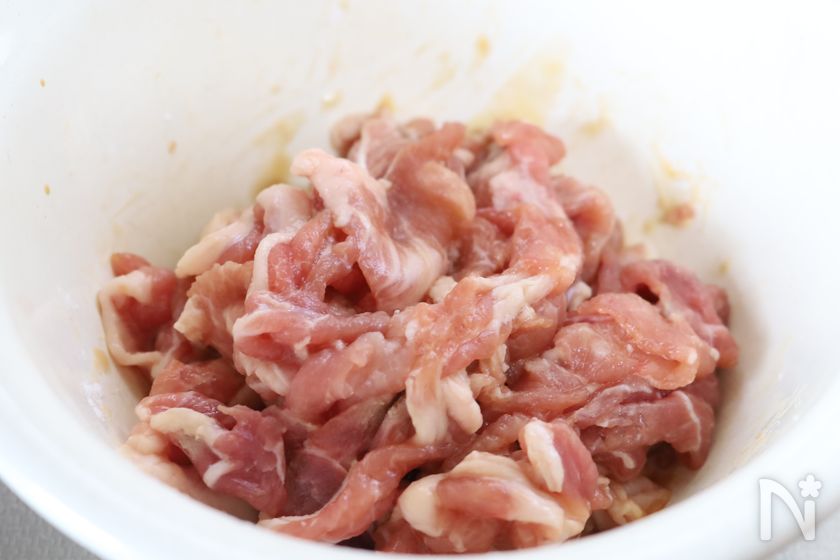 (1) 豚こま切れ肉に【A】を揉み込む。