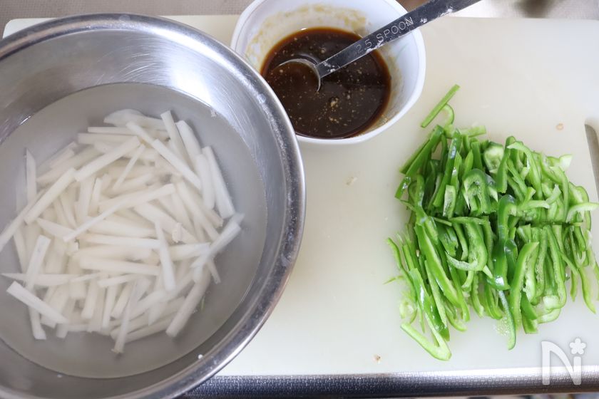(2) ピーマンは種をとり、5mm幅の千切り、蓮根は皮を剥き繊維に沿って5mm幅の千切りし水にさらす。