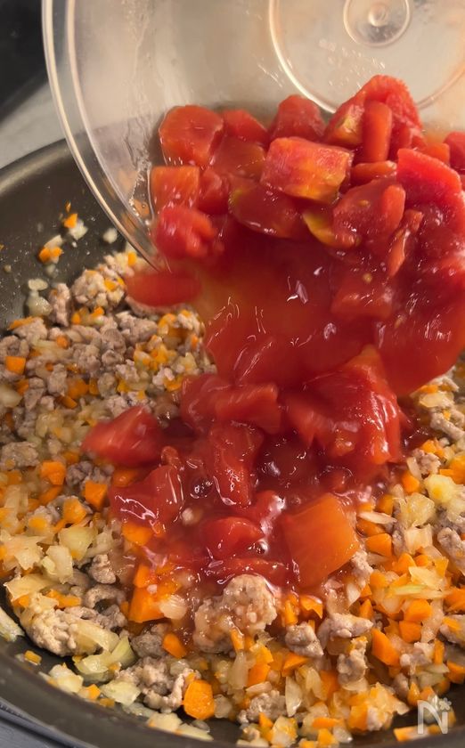 (3) しんなりしたら、塩とトマト缶、水を入れて、ひと煮立ちしたら蓋をして10分煮込む。
