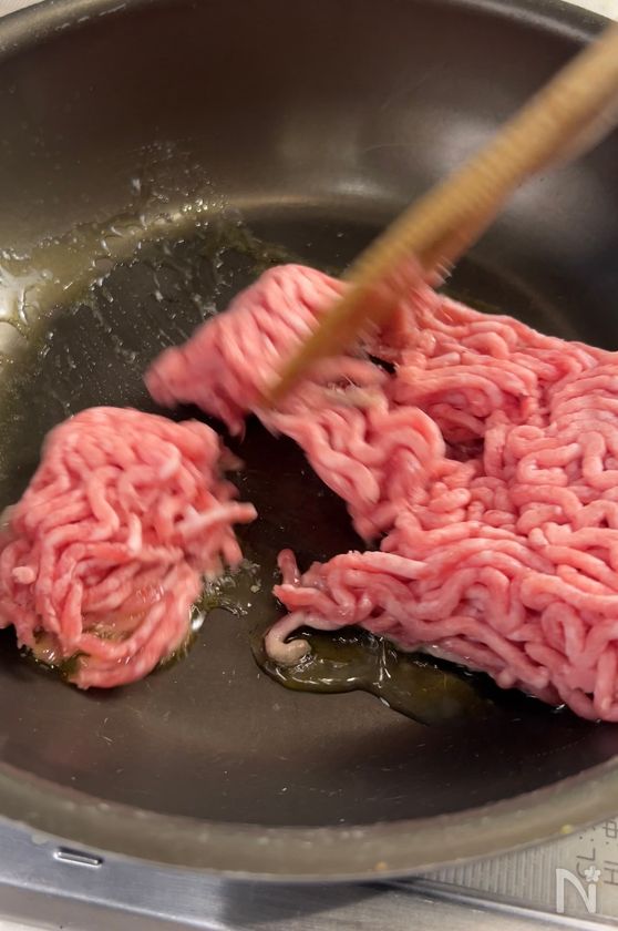 (1) フライパンにオリーブオイルをひき、豚ひき肉を入れて、中火にかける。