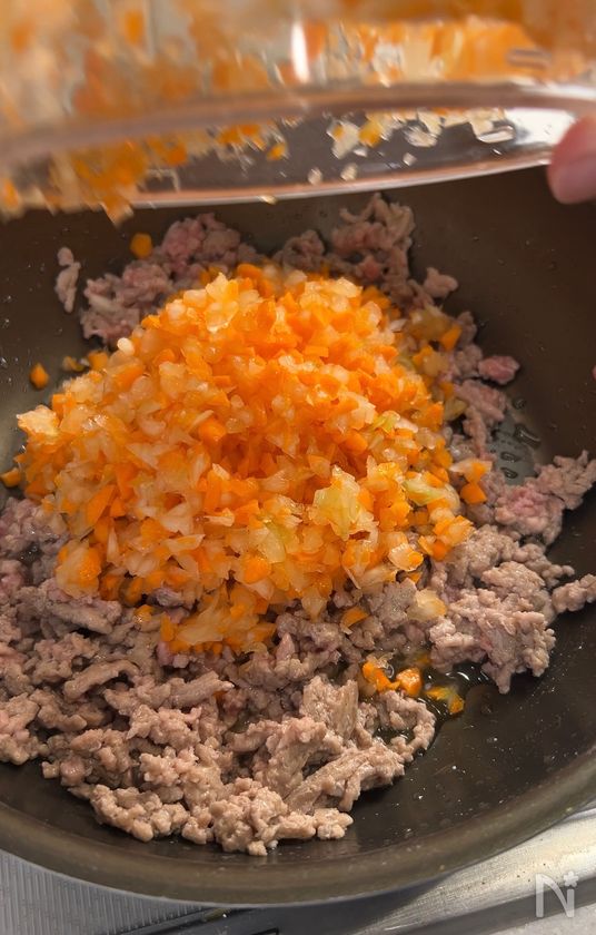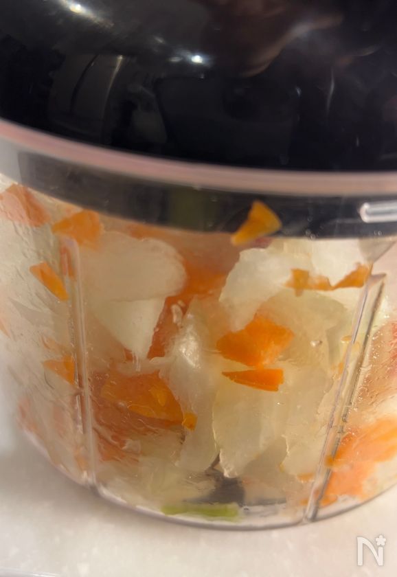 (下準備) ・玉ねぎとにんじんはみじん切りにする。
