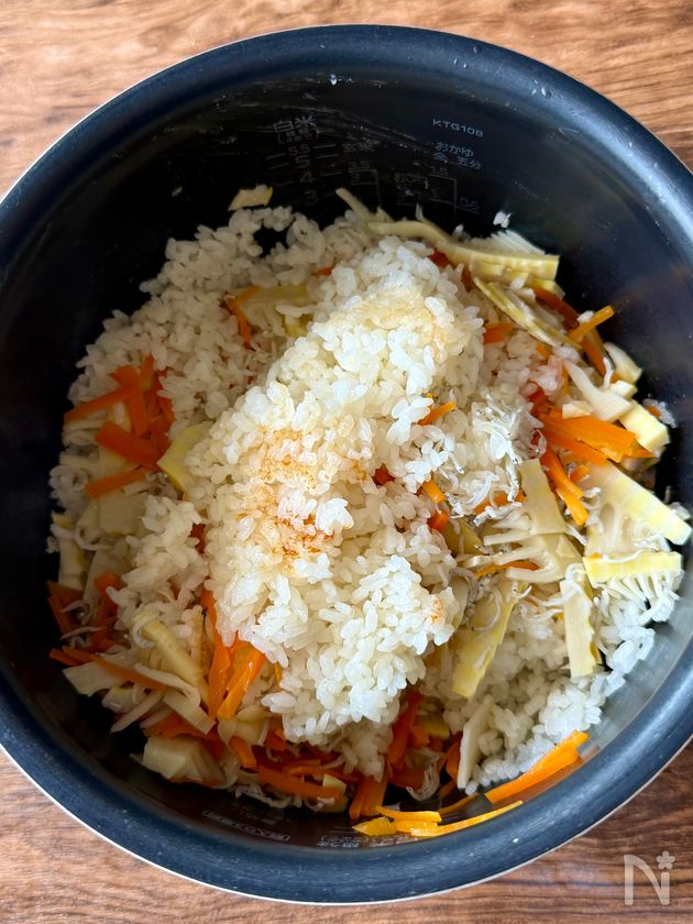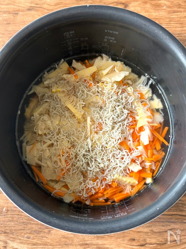 (3) たけのこ、にんじん、ちりめんじゃこをのせて炊飯する。