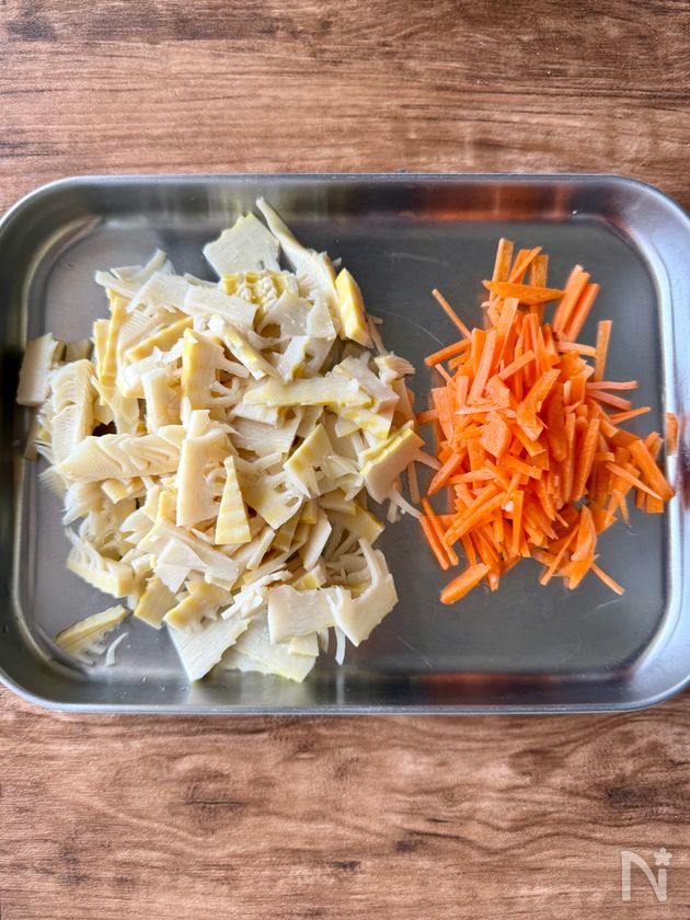 (1) たけのこは食べやすい大きさに切る。にんじんは細切りにする。米は洗ってザルにあげ、水気を切る。