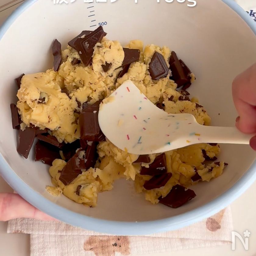 (2) ホットケーキミックスをふるい、しっかりとよく混ぜ、板チョコレートを加え混ぜ、冷蔵庫で15分寝かす。