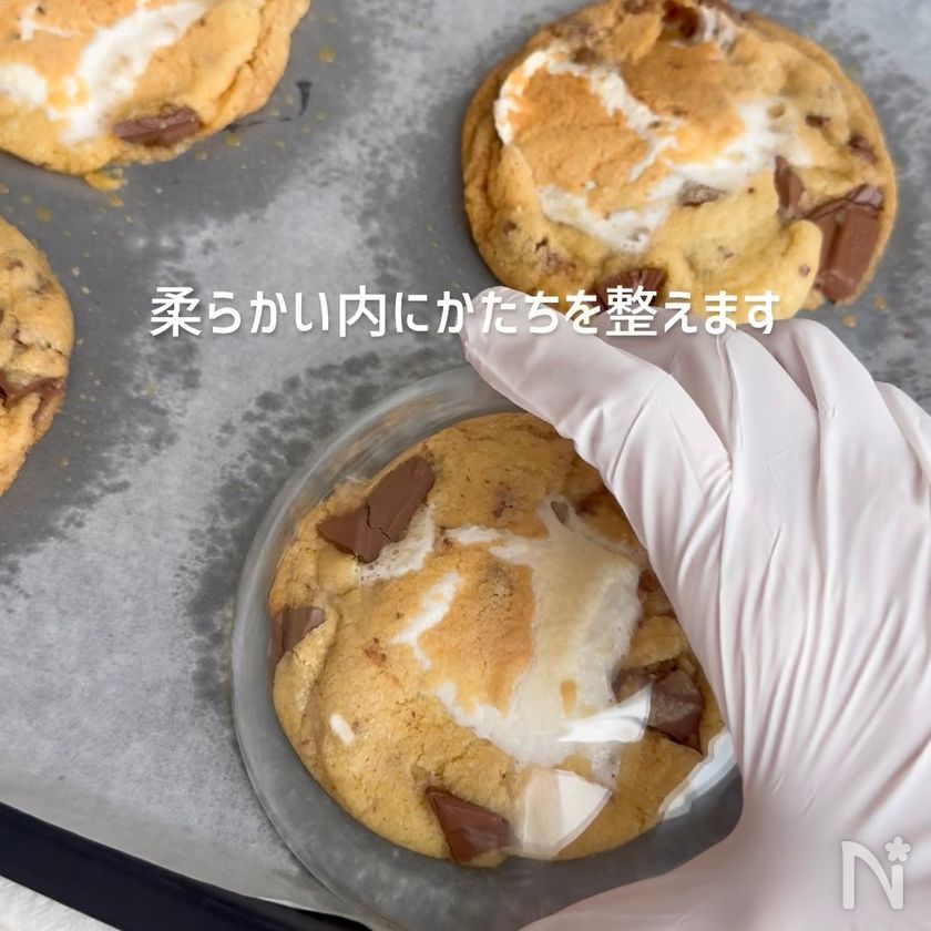(4) 焼けた直後の柔らかい内にセルクルや深皿などで丸く形成し粗熱を取る。