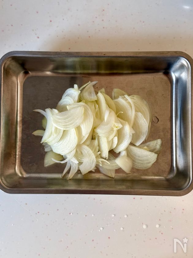 (下準備) 新玉ねぎは縦半分に切り、薄切りにする。