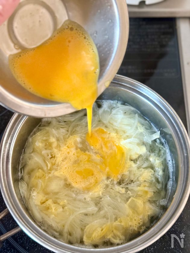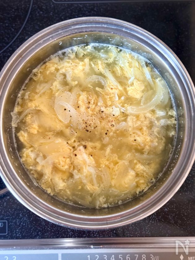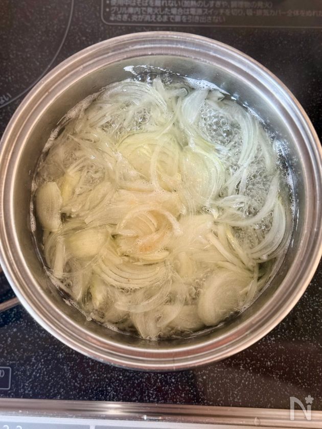 (1) 鍋に水を入れて中火で加熱し、沸騰したら新玉ねぎと鶏がらスープの素加えて2〜3分煮る。