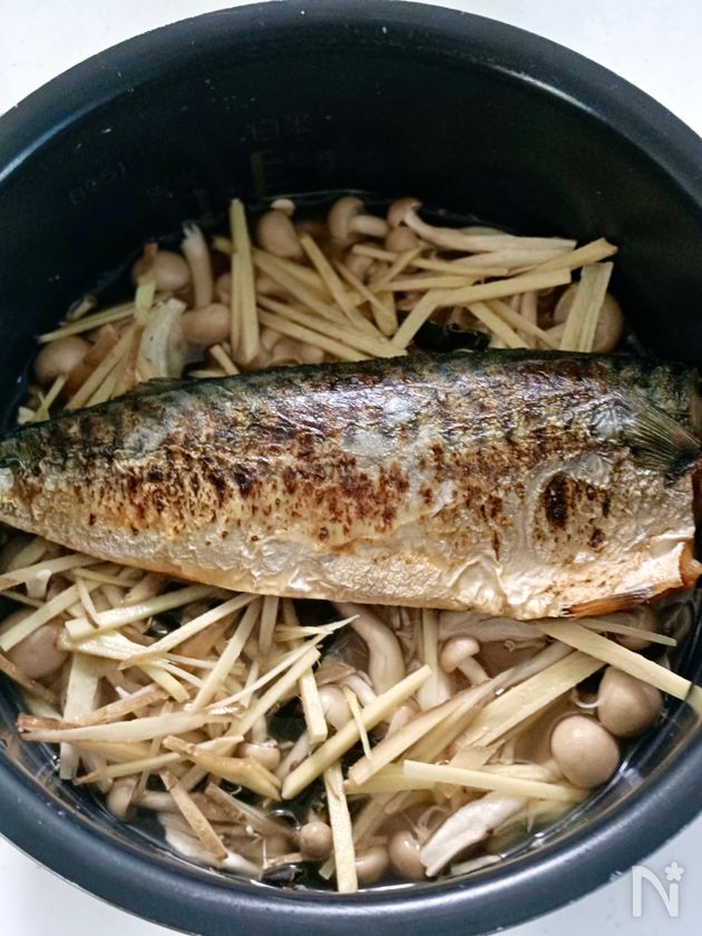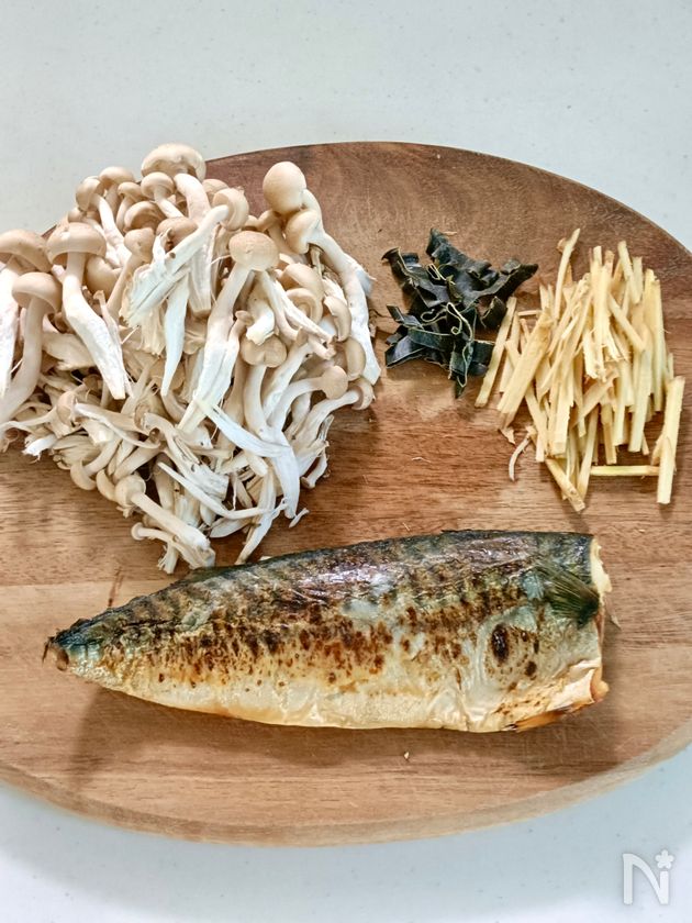 (1) 塩さばをグリルやフライパンで焼き、両面に焼き目をつける。しめじは手でほぐし、生姜は細切り、昆布はキッチンバサミなどで細切りにする。