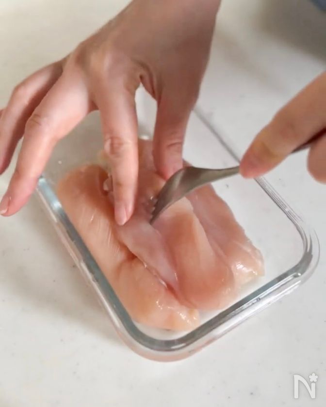 (1) ささみは筋を取り、フォークで数カ所穴をあける。