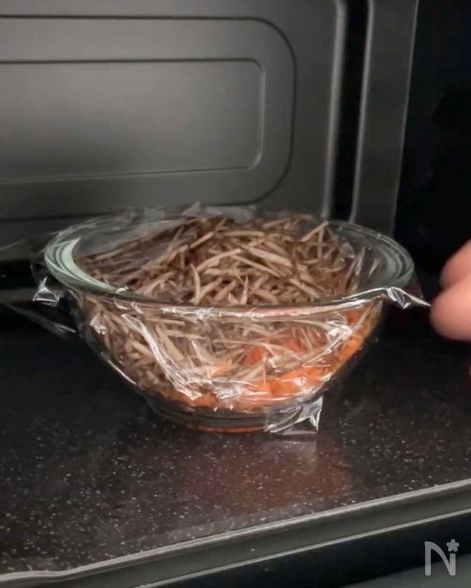 (2) ごぼうと人参を千切りにし、ラップをして600Wの電子レンジで3分加熱する。