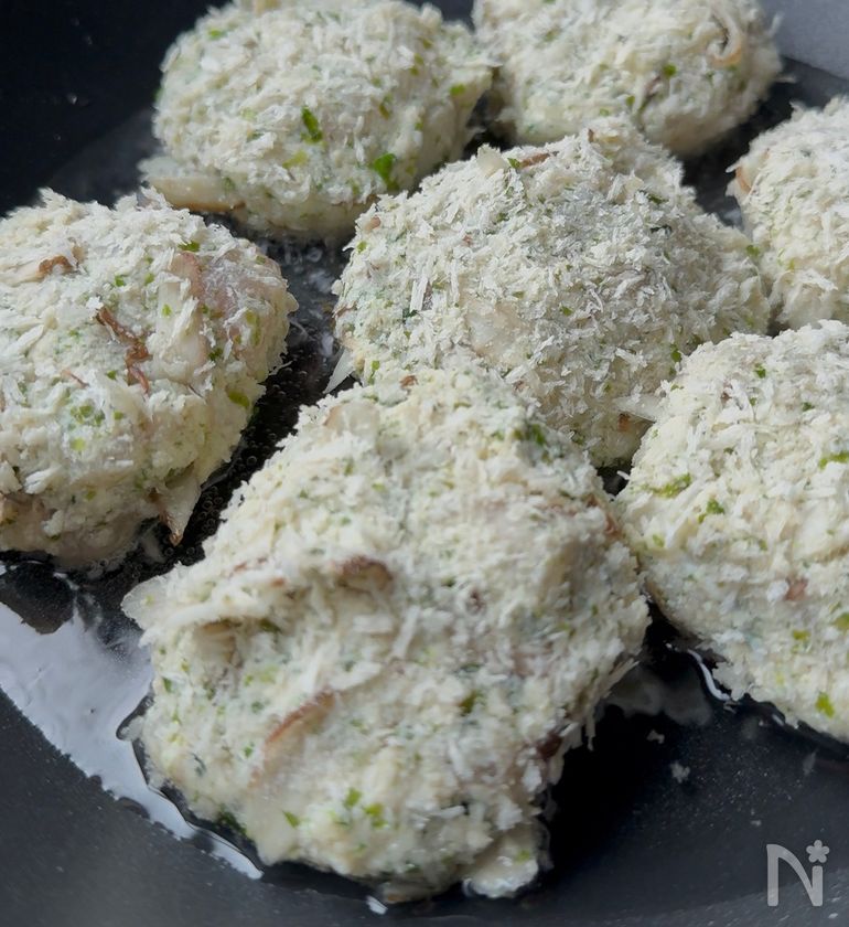 (4) サラダ油を熱したフライパンに3をいれ、中火で焼く。
