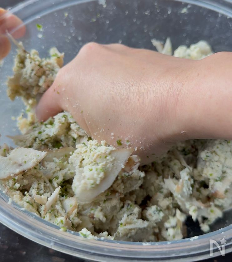 (1) ボウルに、白身魚、水けを絞った冷凍豆腐、ごぼう、【A】を加える。