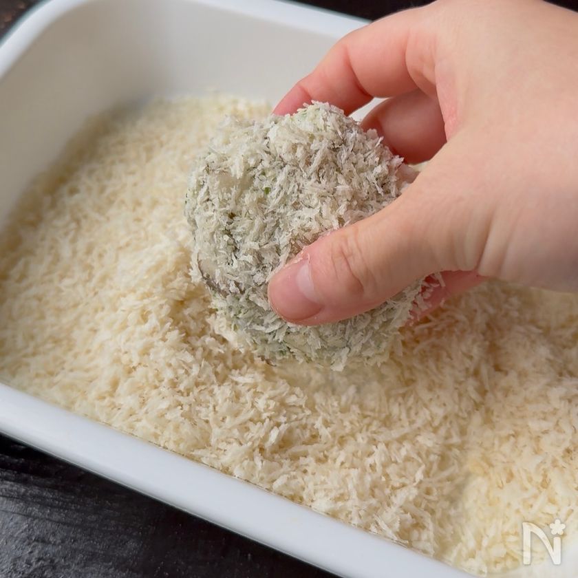 (3) スライスチーズ(とろける)は半分に切り、2で包みながら成形する。パン粉をまぶす。