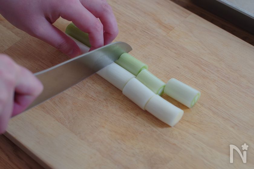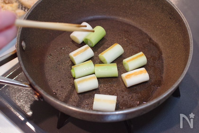 (3) フライパンに油小さじ1(分量外)を入れて白ネギを焼き色がつくまで焼く。