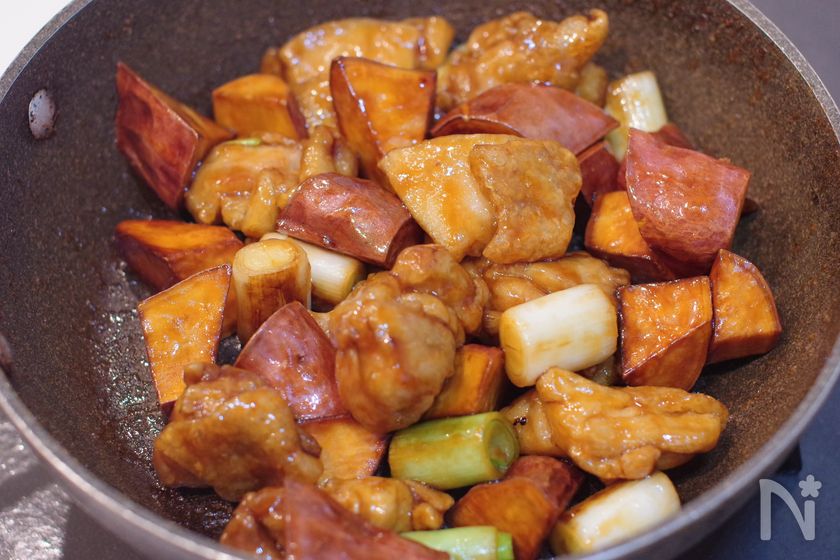 (4) 揚げた鶏肉とさつまいも、【A】を加え照りが出るまで煮絡める。
