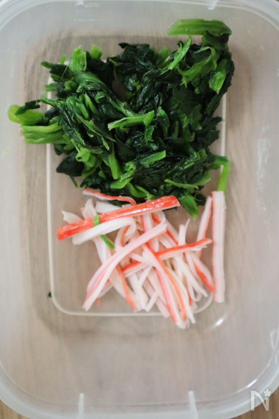 (1) ボウルにほうれん草、カニカマ、【A】を入れ、全体に味がなじむようにしっかり混ぜ合わせる。